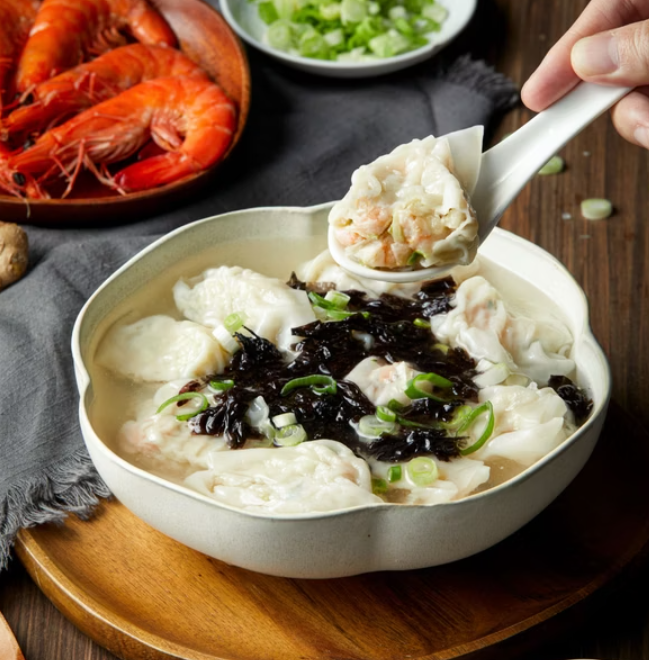 產品成份: 白蝦、餛飩皮(麵粉.水.鹽)、高麗菜、雞胸、高湯(水、雞胸骨、雞腳、洋蔥、海帶、芹菜、薑、豬皮(台灣))、青蔥、魚露(鯷魚、鹽、糖)、薑末、醬油、芝麻油、海鹽、糖、白胡椒