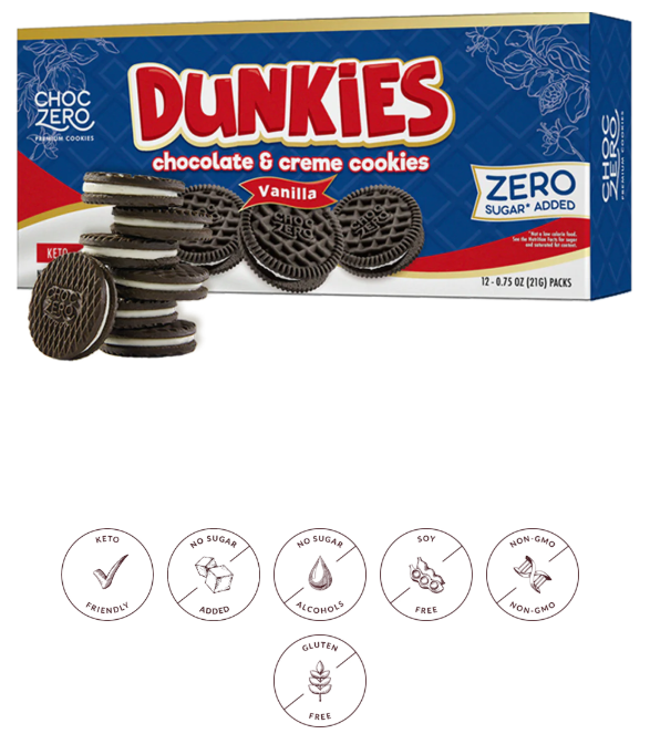 Each box contains 9oz of chocolate sandwich cookies with vanilla cremeGluten free with zero sugar added3g net carbs per 2 cookiesMade without wheat, without soy, and without any artificial sweeteners