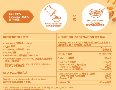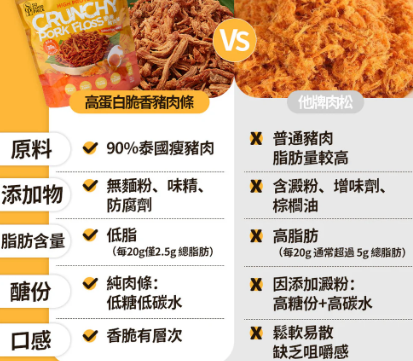 精選優質瘦豬肉(90%),經過獨特工藝酥脆處理,每份高達39克蛋白質,帶來滿滿的能量與滿足感。